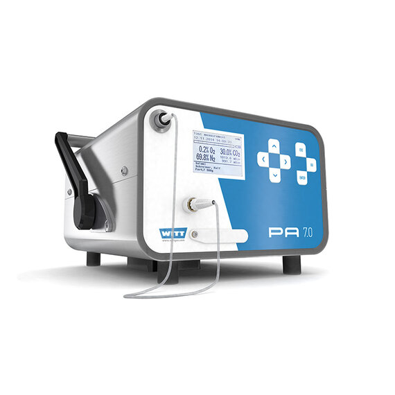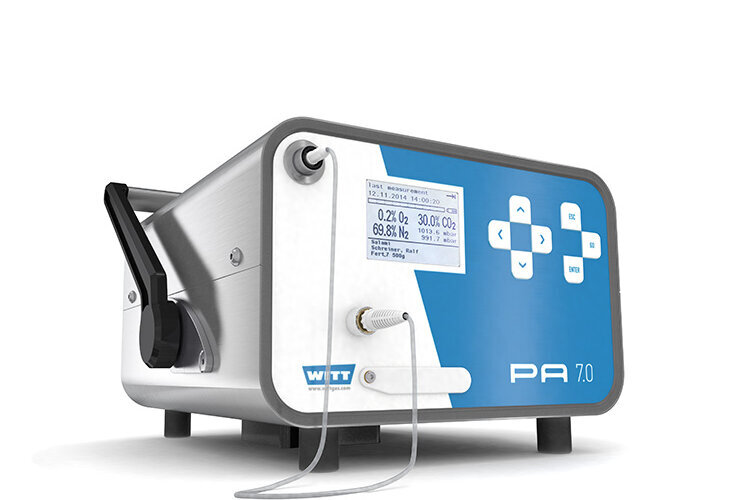Der PA 7.0 von WITT ist ein kompakter Gasanalysator für die Überwachung von Schutzgasatmosphären in der Lebensmittelverpackung (MAP) und beim Schweißen. Er ermöglicht sowohl kontinuierliche Inline-Analysen als auch Stichprobenmessungen aus Verpackungen. Das Gerät bietet schnelle, präzise Messergebnisse und einfache Bedienung über ein großes, beleuchtetes Display. Daten können per Mini-USB oder SD-Karte übertragen und gespeichert werden.