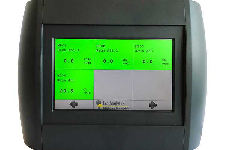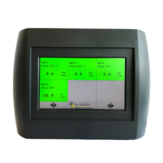Die 7-Zoll-AP-Version wird direkt über Modbus von der Gaswarnzentrale angesteuert. Die Farbwechselanzeige signalisiert den aktuellen Status: Grün (Normalbetrieb), Gelb (Voralarm oder technische Störung) und Rot (Gashauptalarm). Das robuste Display bietet eine klare, gut ablesbare Darstellung und ist ideal für den Einsatz in Forschungseinrichtungen.